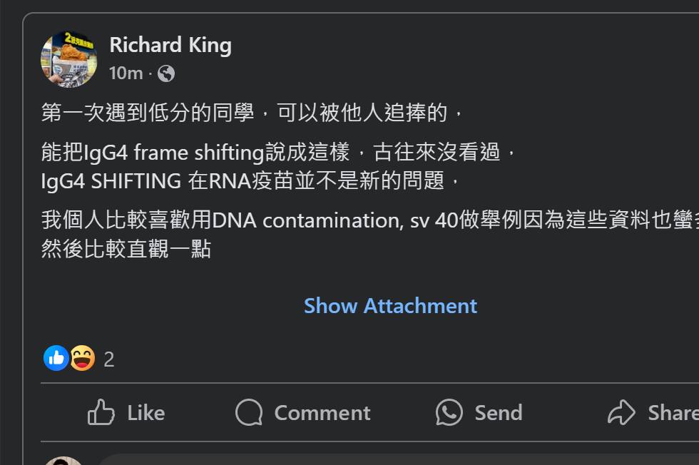 所以他放的第一篇發現打了mRNA疫苗後igG4提高的研究報告就有指出,打了後的前5週是igG1和igG3(促進發炎的抗體)比較高,之後是igG4(降低發炎的抗體)會提高,